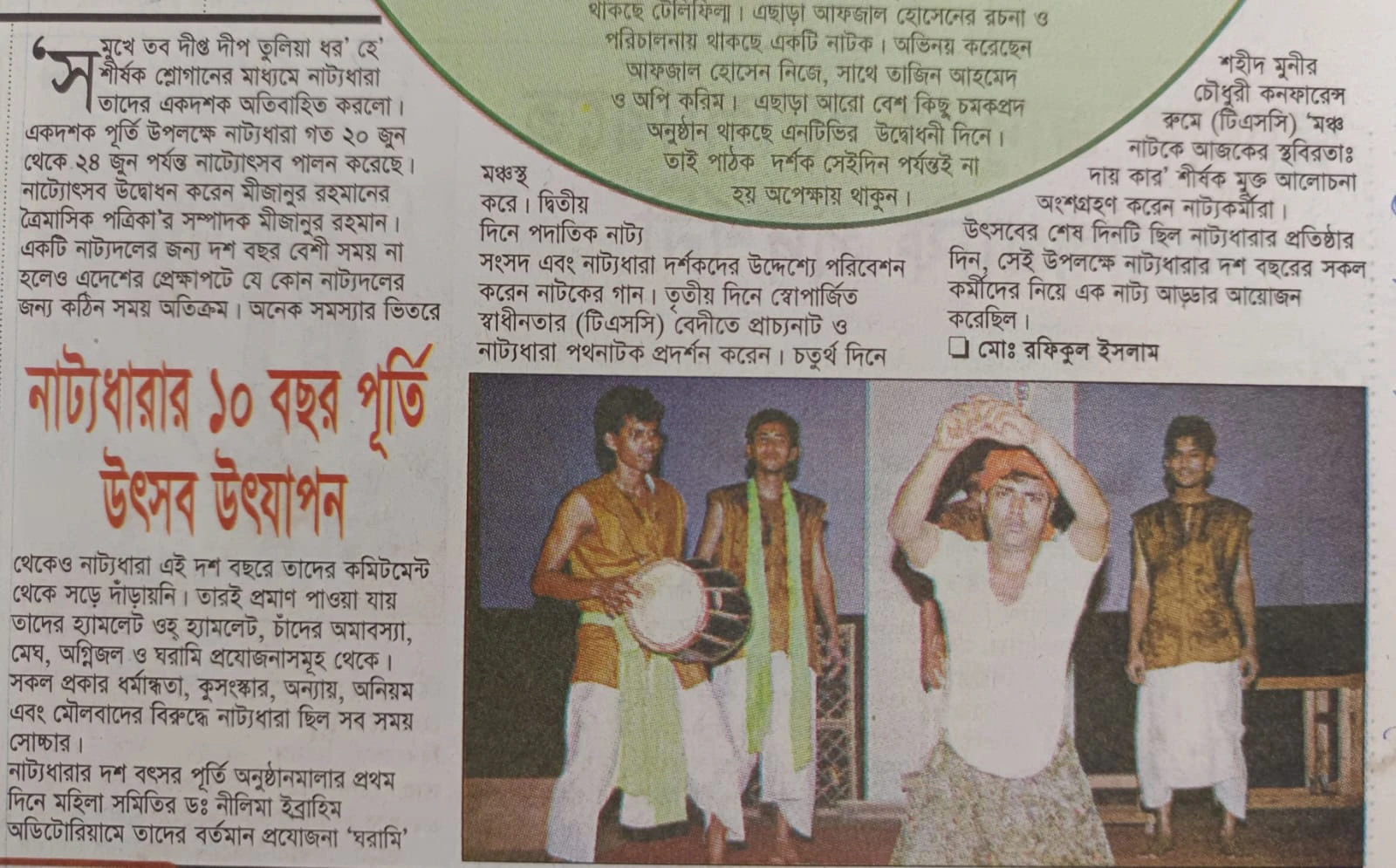 Since beginning its journey on June 24, 1993, Natyadhara has pursued freshness over imitation. Believing that art and culture embody existence, the organization is deeply devoted to both life and art. Natyadhara remains committed to fighting fanaticism, superstition, narrow-mindedness, injustice, and all forms of fundamentalism through its artistic efforts.
