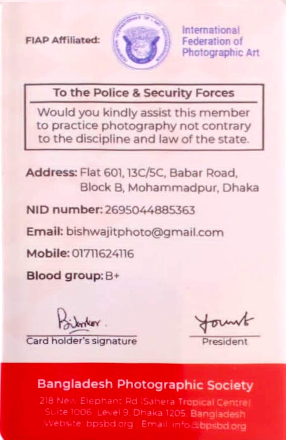This lifetime membership in BPS is a meaningful recognition of Bishwajit Sarker’s long-standing commitment to photography and the photographic community in Bangladesh. It reflects years of dedication, learning, and contribution marking an important milestone in his ongoing photographic journey.
